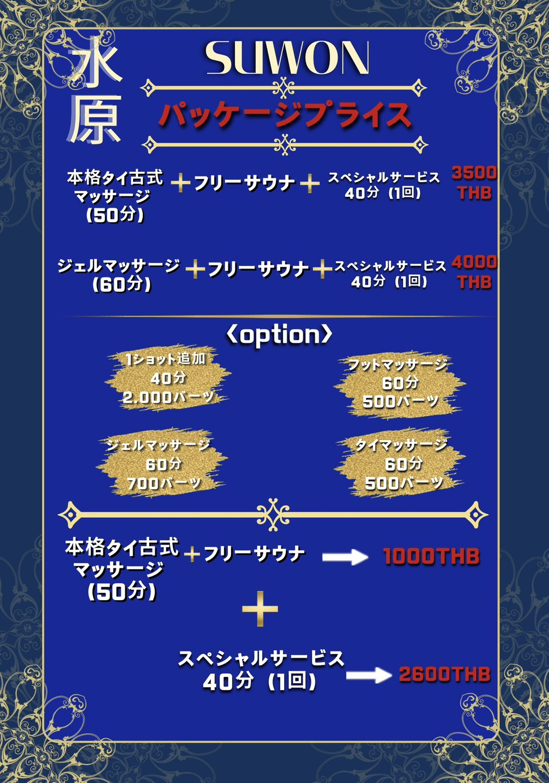 | 本格タイ古式マッサージ 50分 + スペシャルサービス 40分(1 Shot) ※フリーサウナ付き | 3,500 THB |